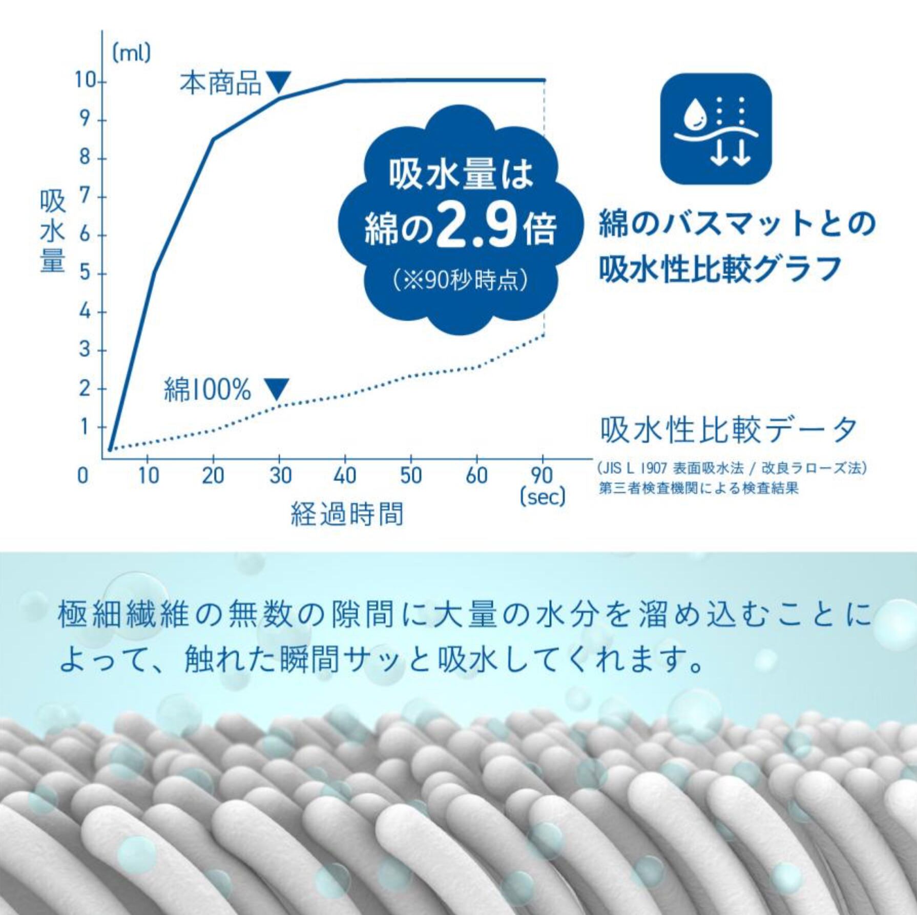 水に触れた瞬間にサッと吸水してくれます。その吸水力は綿のバスマットの2.9倍です!