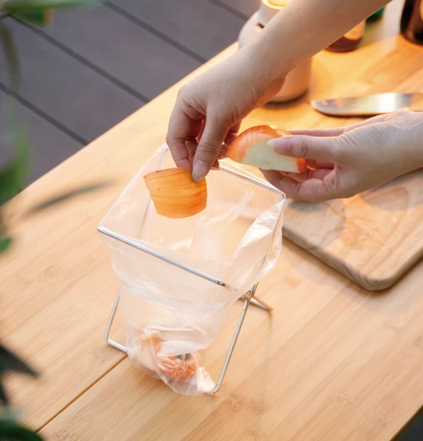 市販のポリ袋やビニール袋をセットするだけで、簡易ゴミ箱として使えるポリ袋スタンド。片手で簡単に開閉できるので、使わないときは口を閉じれば気になる生ごみの匂いもカットします。畳めばスリムかつ軽量なので、自宅のキッチンだけでなくBBQやキャンプなどに持って行って使うのもおすすめです。