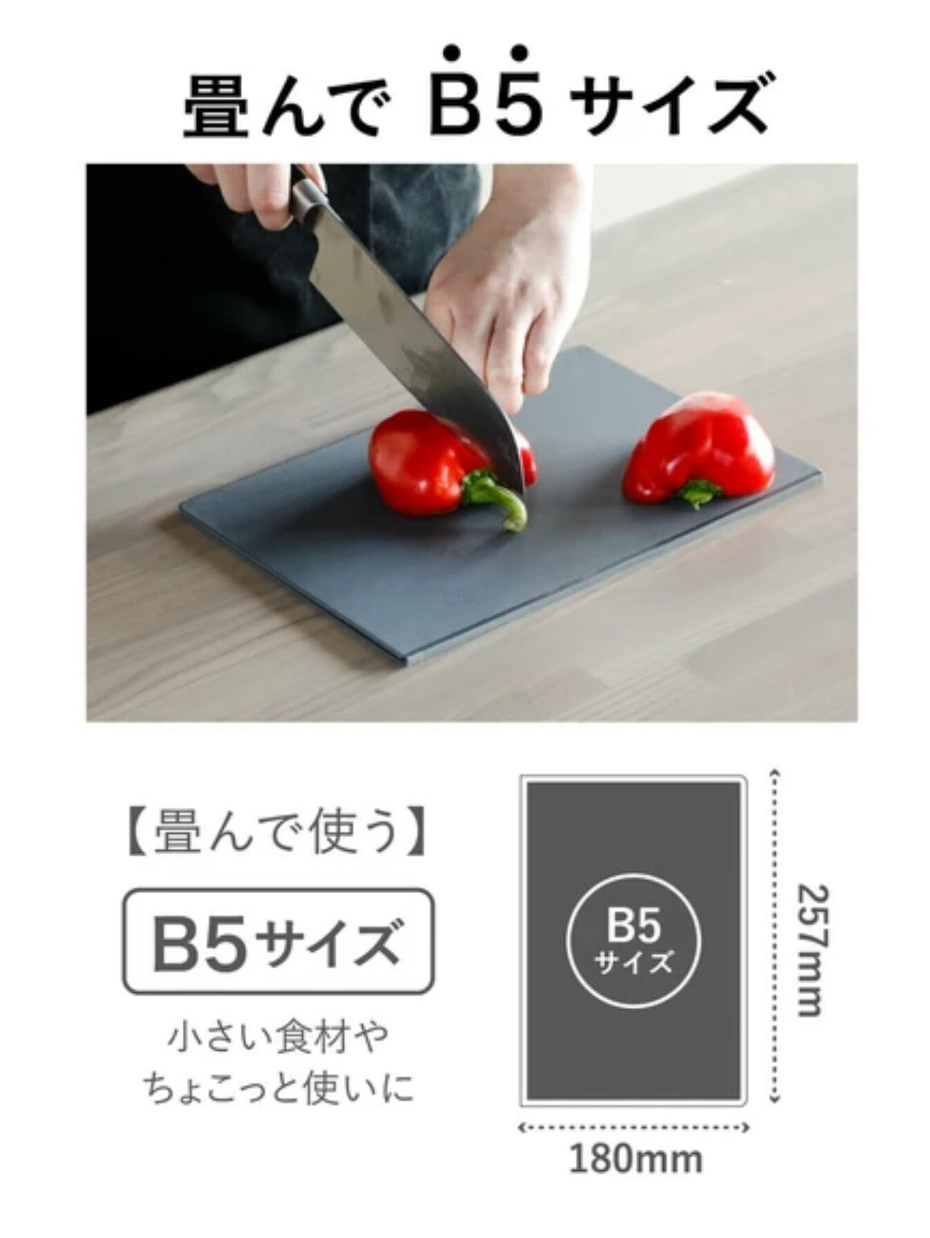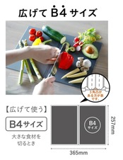 両面使えるので、大きい食材を切るときは広げて使ったり、小さい食材やちょこっと使いは畳んでと、場所や食材に合わせて便利に使えます。