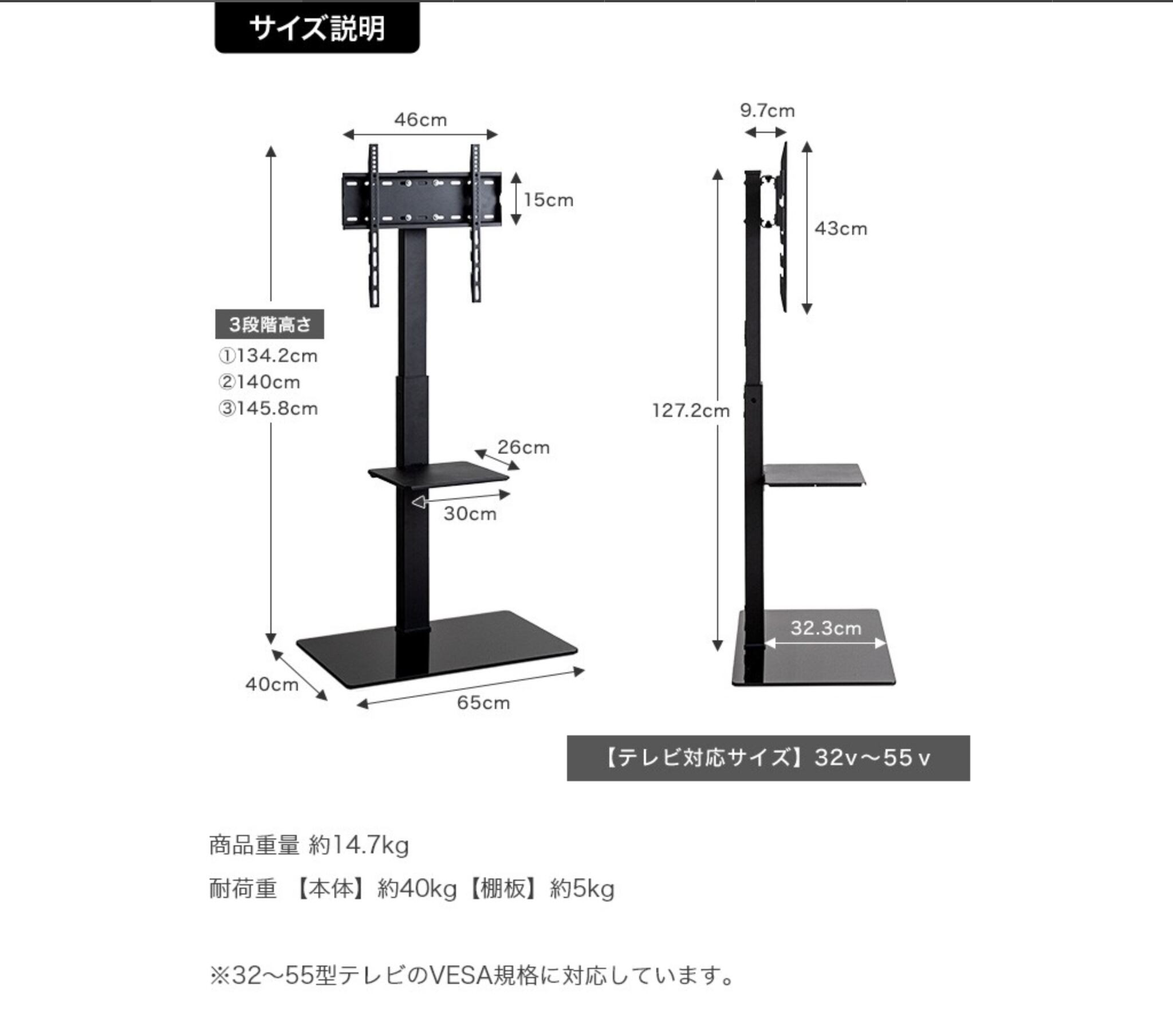 【商品サイズ】幅65cm×奥行40cm×高さ134.2〜145.8cm