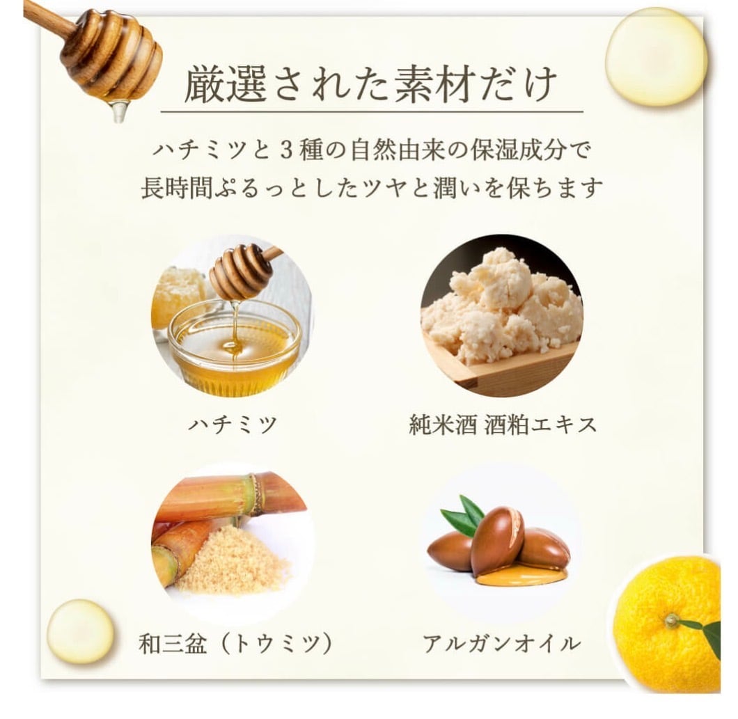 ■素材・成分:ワセリン、ユズ果皮油*、ユズ種子油、アルガニアスピノサ核油、ハチミツ、トウミツ、酒粕エキス、トコフェロール【*は植物から抽出した精油を使用しています。】