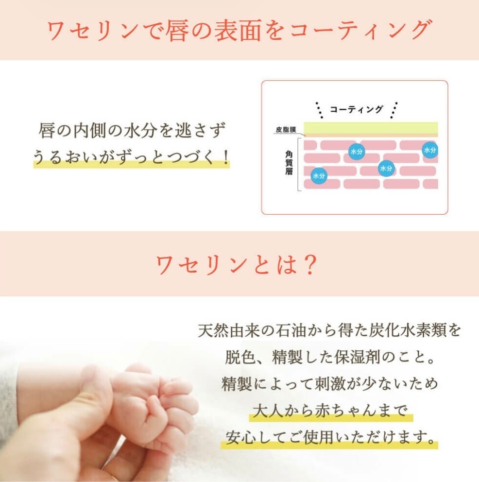 ●唇に合わない時、使用中に赤み、はれ、かゆみ、刺激、色抜け(白斑等)や黒ずみ等の異常が出た時、日光があたって同様の異常が出た時は使用を中止し、皮フ科医に相談してください。使い続けると症状が悪化することがあります。