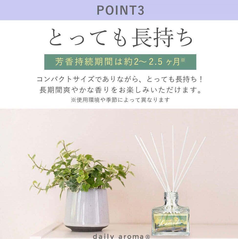 芳香持続期間は約2〜2.5ヶ月(使用環境や季節によって異なります)。
