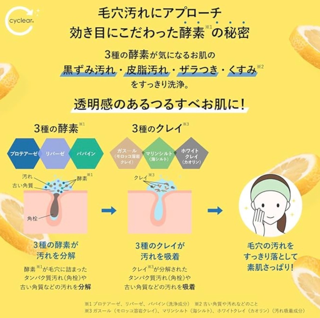 ■素材・成分:水、ラウリン酸、ミリスチン酸、コカミドDEA、水酸化K、グリセリン、コカミドプロピルベタイン、ラウレス硫酸Na、コカミドMEA、パルミチン酸、アスコルビン酸、グリセリルアスコルビン酸、テトラヘキシルデカン酸アスコルビル、アスコルビルグルコシド、パパイン、デキストリン、プロテアーゼ、リパーゼ、モロッコ溶岩クレイ、海シルト、カオリン、レモン果実エキス、グレープフルーツ果実エキス、PPG−8セテス−20、PPG−4セテス−20、リン酸2Na、リン酸K、BG、エタノール、β−カロチン、ソルビトール、オレイン酸ポリグリセリル−10、トコフェロール、トリ(カプリル酸/カプリン酸)グリセリル、塩化Na、ポリクオタニウム−7、変性アルコール、EDTA−4Na、エチルパラベン、フェノキシエタノール、安息香酸Na、香料