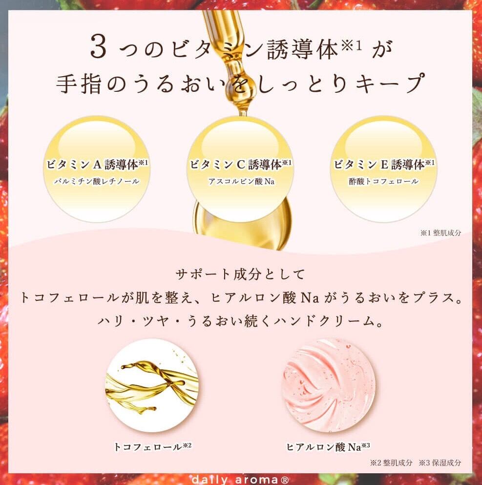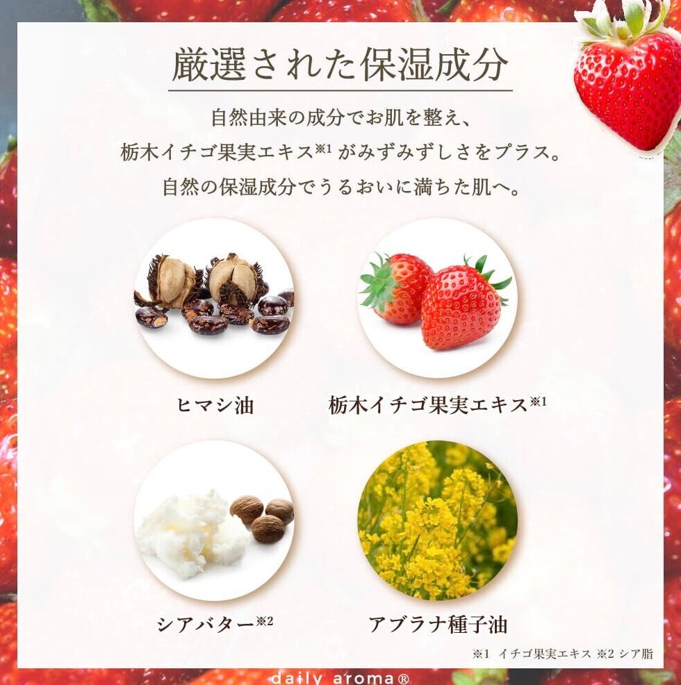 栃木の恵みとシアバター※2、2種のビタミン誘導体※3 が、乾燥から守りながらしっとり感をキープ。仕上げに広がるのは、甘酸っぱいいちごの香り。使うたび、指先から果実の物語が広がります。
