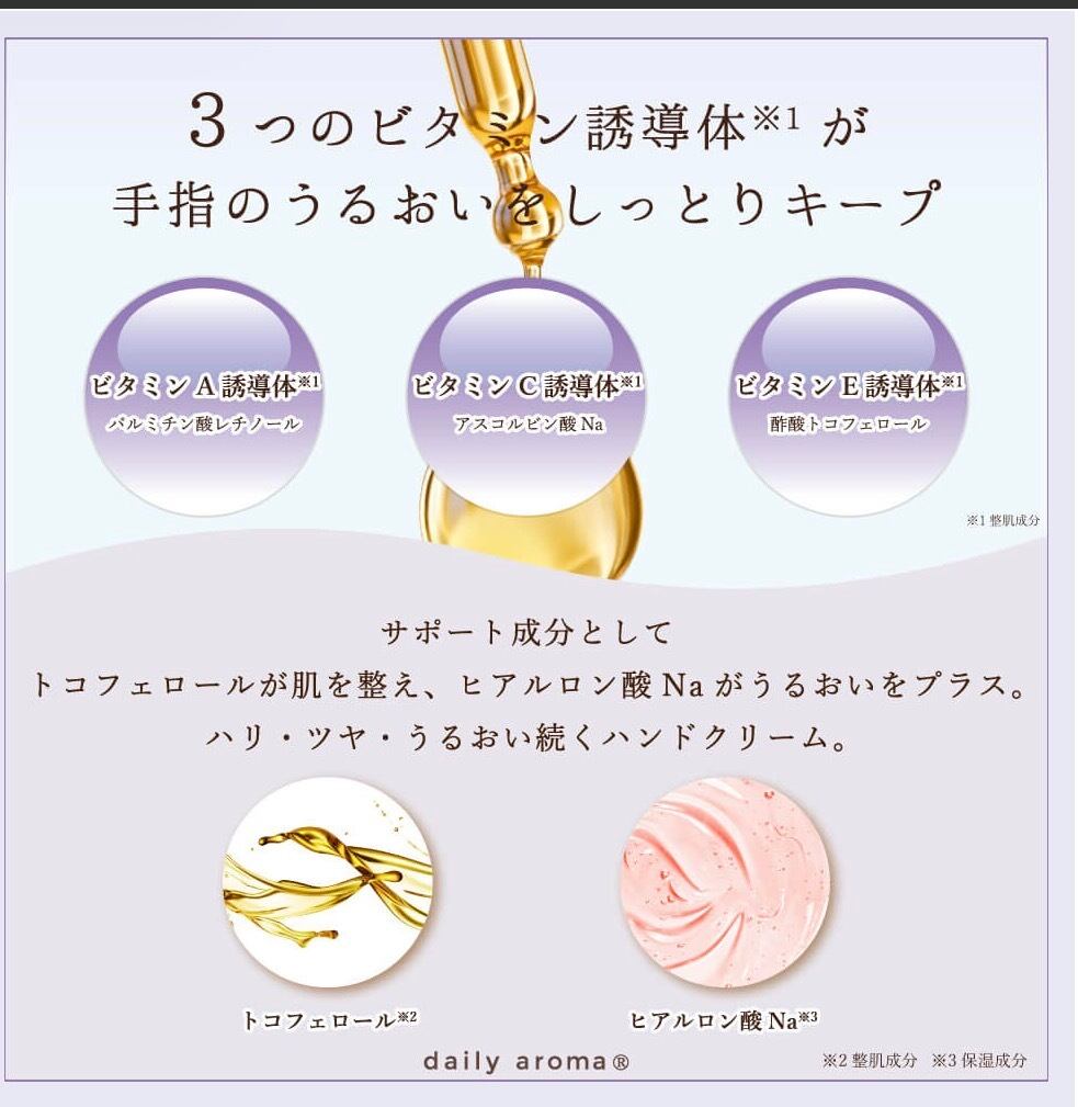 国産ぶどうポリフェノール※1とシアバター※2 そして2つのビタミン誘導体※3 が手指のうるおいをしっとりキープ。巨峰のジューシーな甘い香りが広がります。