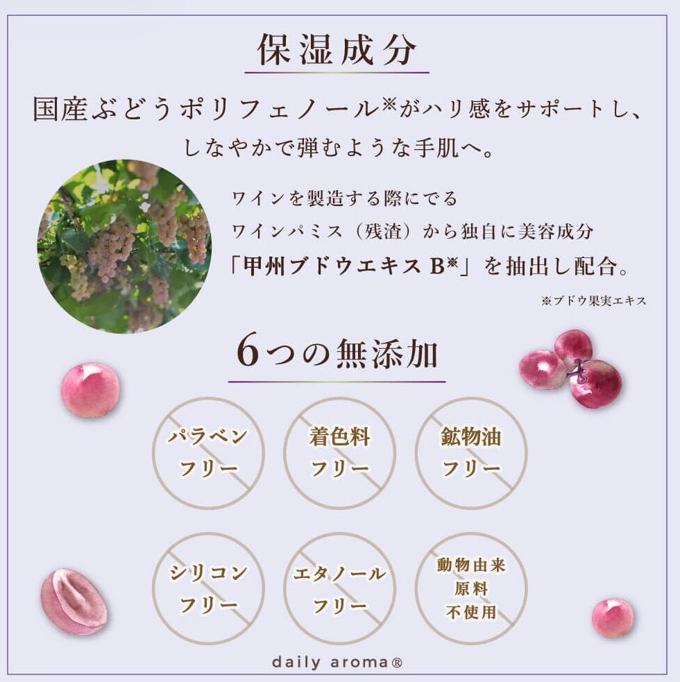 自然豊かなこのワイナリーで育った「甲州ブドウ」からワインを製造する際にでるワインパミス(残渣)から独自に美容成分「甲州ブドウエキス※」を抽出配合。巨峰のように艶やかでみずみずしく、柔らかく弾力のある美しい肌へ導きます。